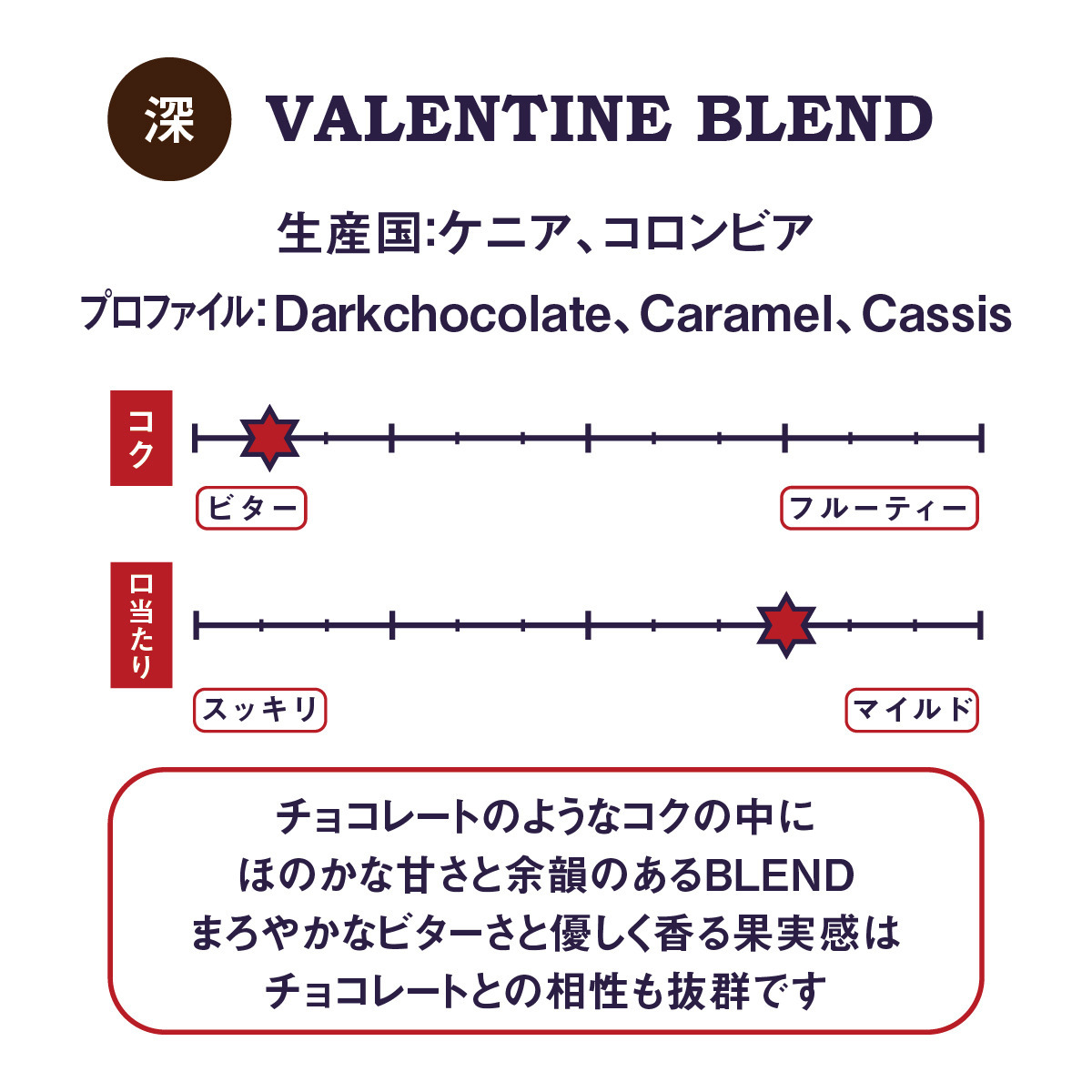 チョコレートのようなコクの中に、ほのかな甘さと余韻のあるBLEND。