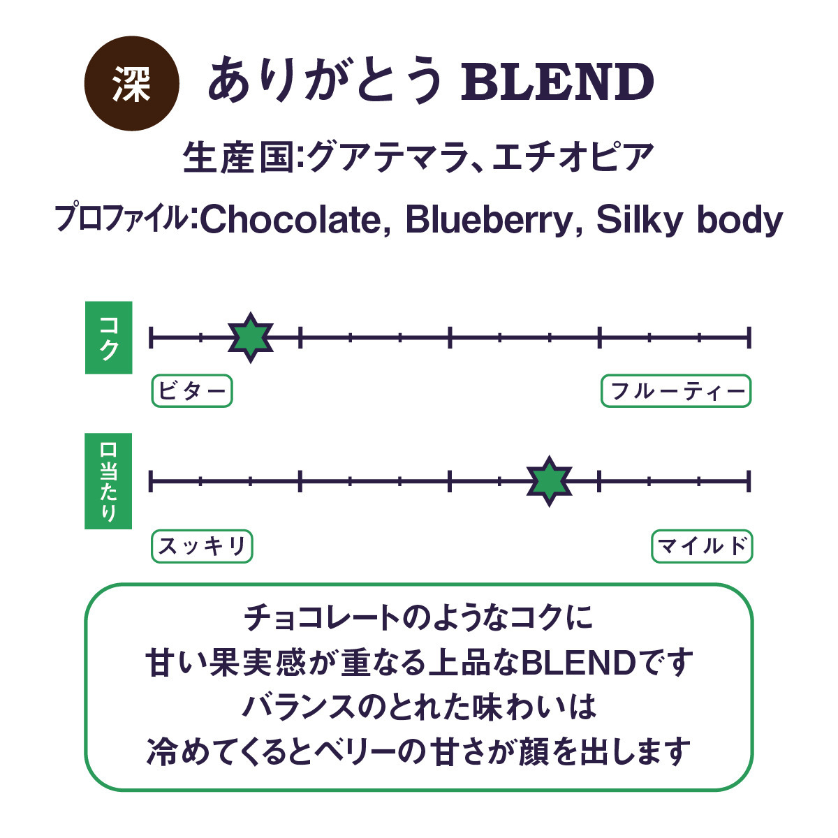 チョコレートのようなコクに、甘い果実感が重なる上品なBLENDです。