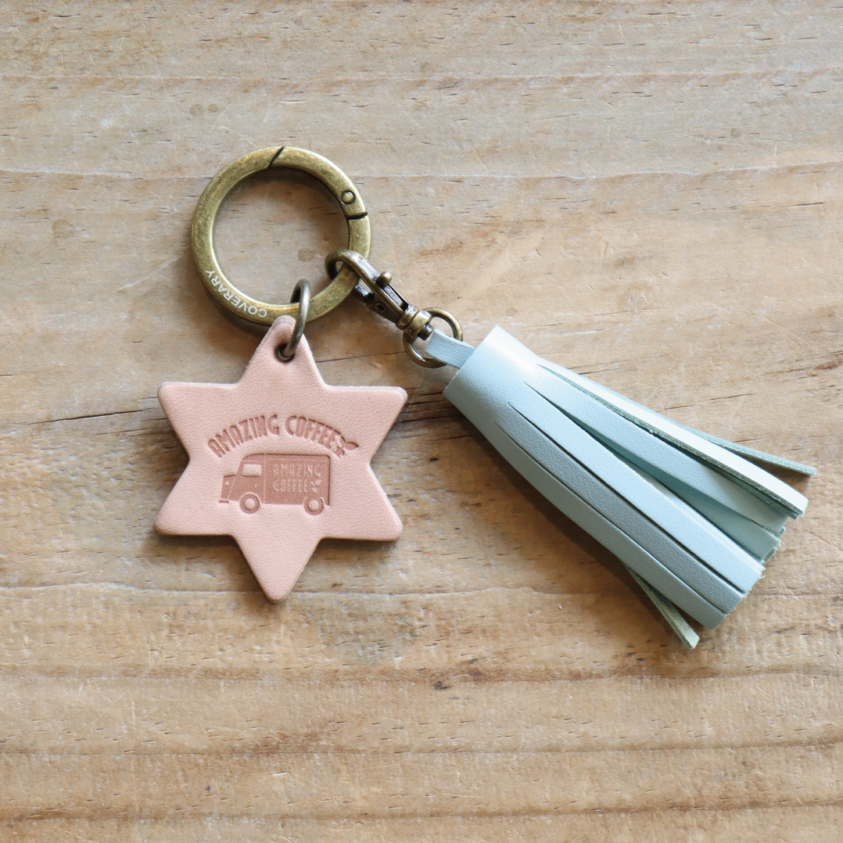 六芒星型のレザーチャームに各店限定カラーのタッセルが付いています!