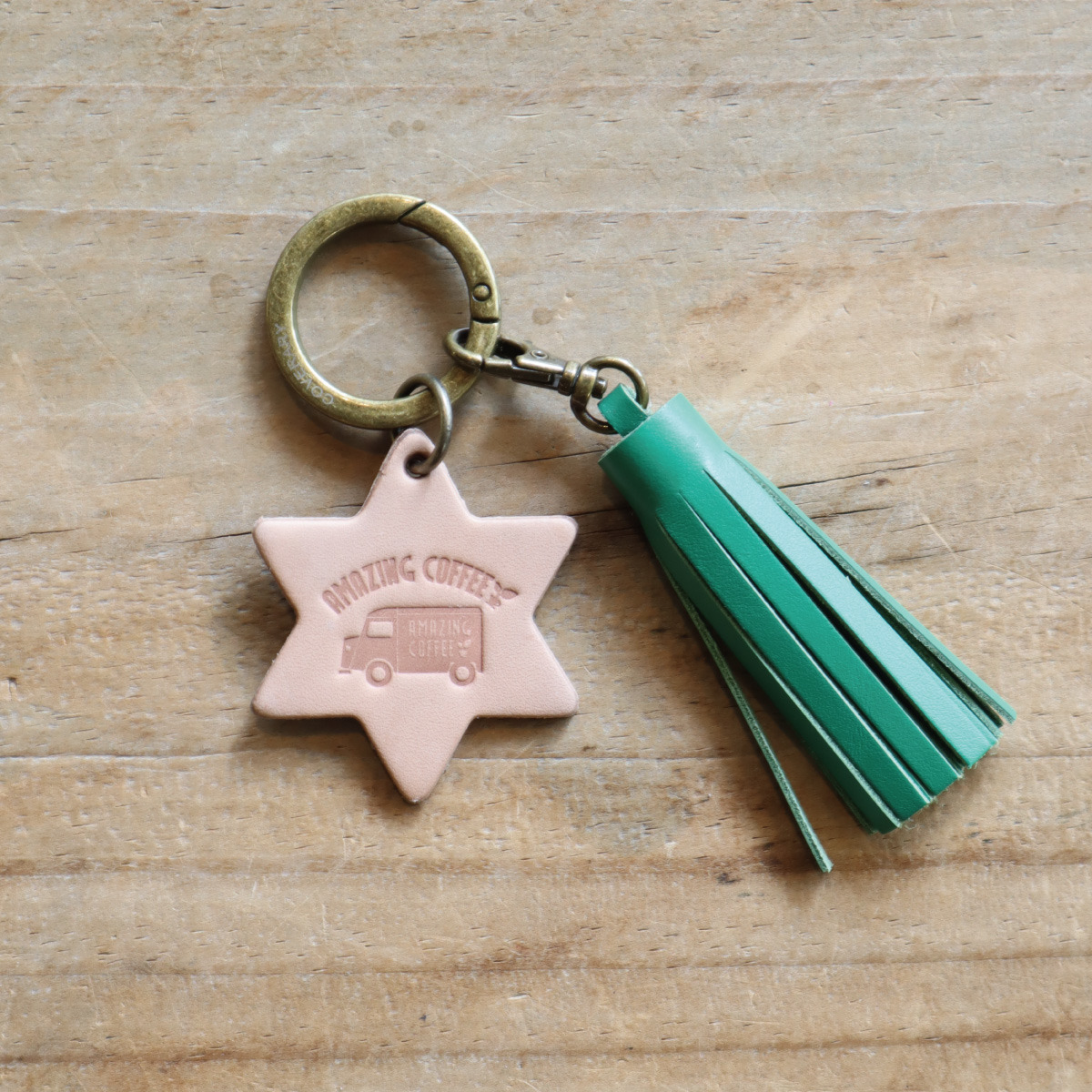 六芒星型のレザーチャームに各店限定カラーのタッセルが付いています!
