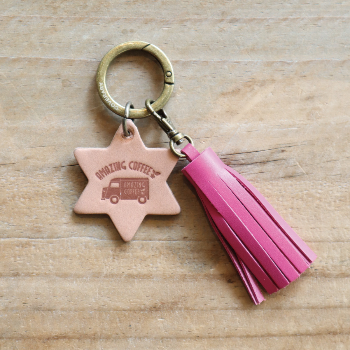 六芒星型のレザーチャームに各店限定カラーのタッセルが付いています!