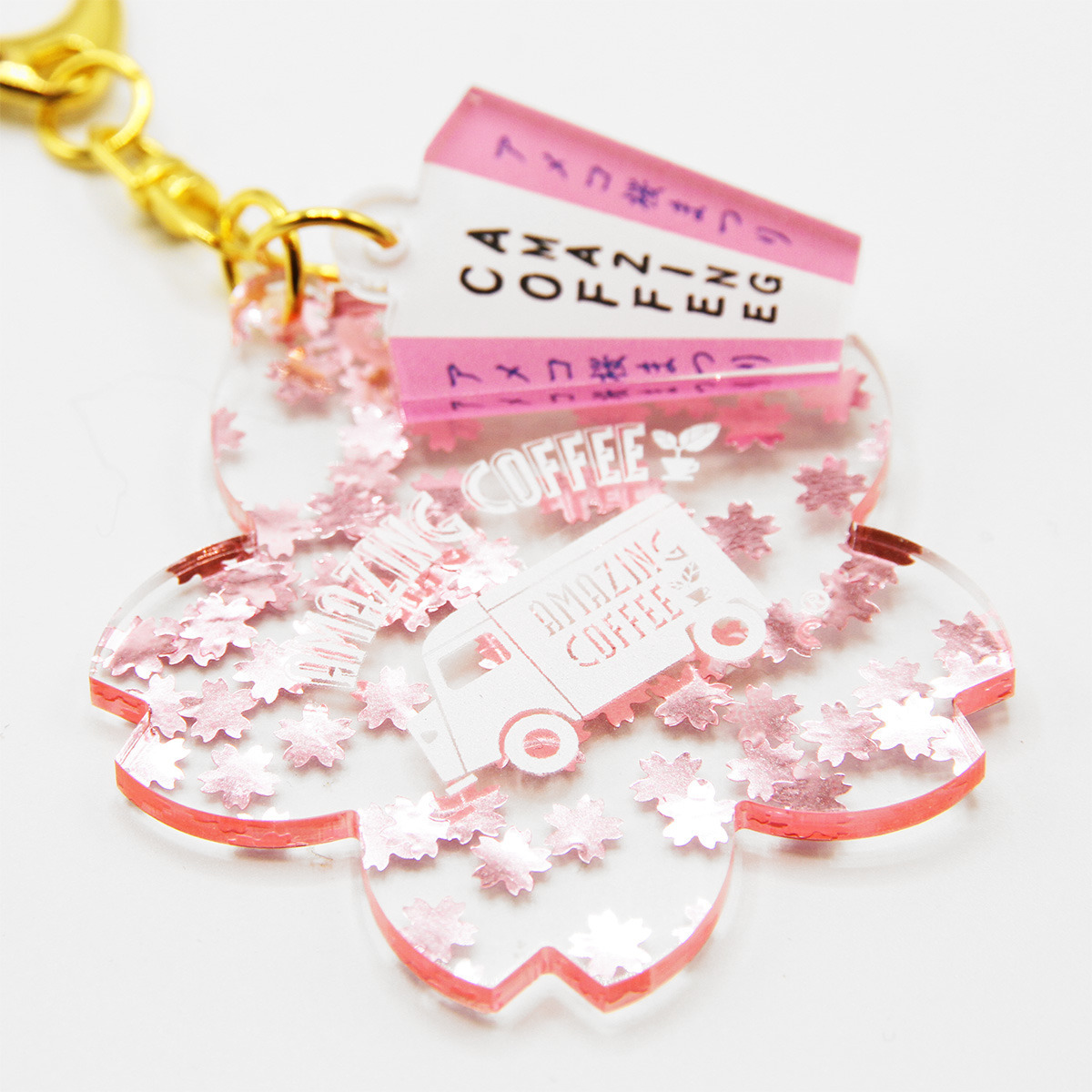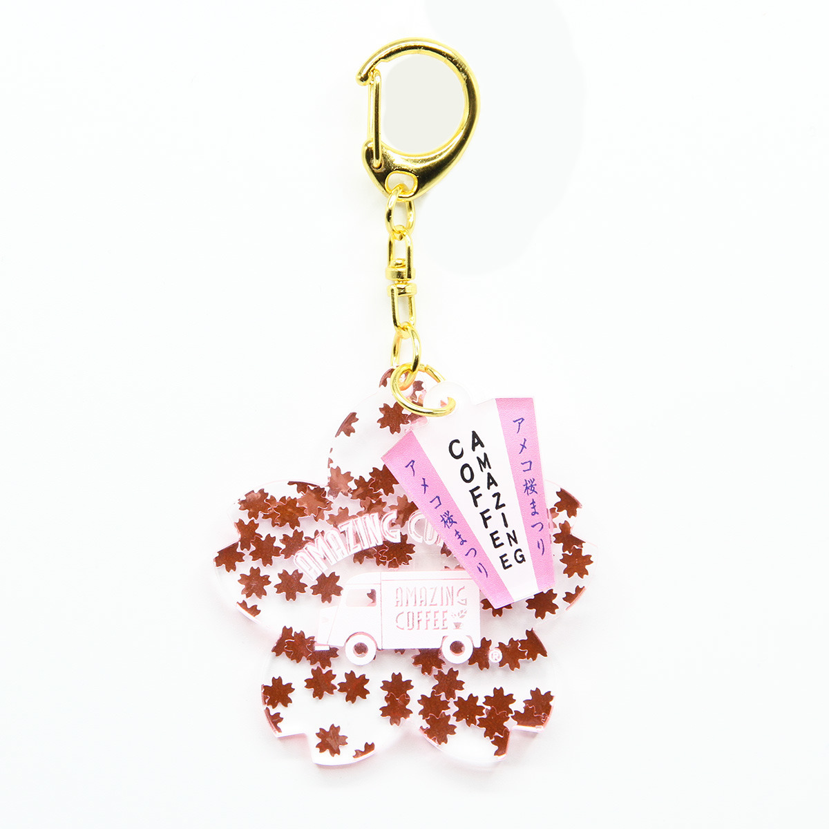 さくら型のアクリルチャームの中に、見る角度によってさくらの花びらチップがきらめくキーホルダーです!